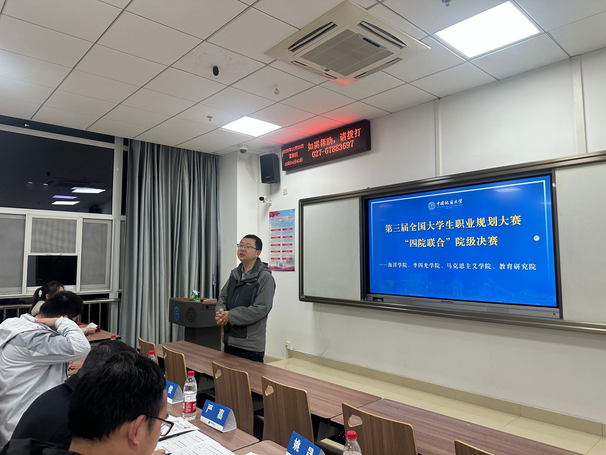 为深化高校生涯教育内涵建设,强化就业指导服务实效,引导大学生树立科学职业观与发展观,11月20日晚,由马克思主义学院、海洋学院、李四光学院、教育研究院联合主办的第三届大学生职业规划大赛决赛在东区综合楼顺利落幕。经过院级初赛、专题培训等多轮严格筛选与激烈角逐,来自四院的12名优秀学子从众多参赛者中脱颖而出,在决赛舞台上充分展现了新时代青年的职业追求与青春担当。